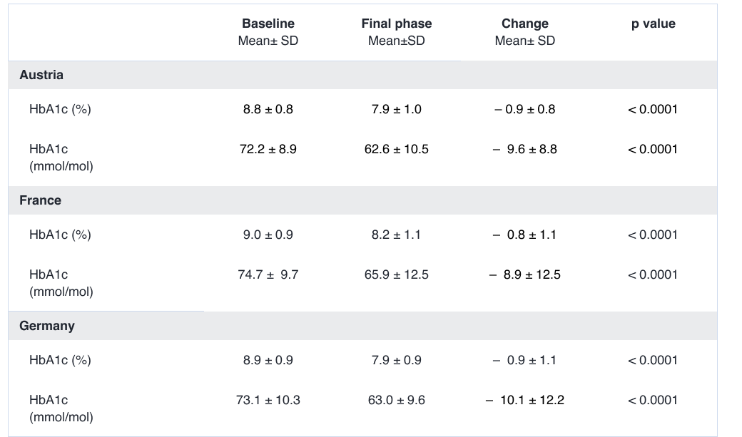 ➤ HbA1c decrease was more pronounced in patients with baseline HbA1c levels ≥75 mmol/mol (≥9.0%) (Fig 2).