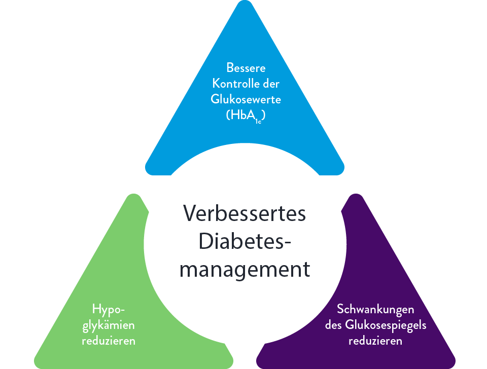 Mit dem FreeStyle Libre Messsystem sind Menschen mit Diabetes in der Lage, die Ziele der drei Bereiche des Dreiecks der Diabetesbehandlung zu erreichen und ihre allgemeine Glukosekontrolle zu verbessern. Auch wenn eines der drei Ziele nicht erreicht werden kann, wirkt sich die Verbesserung von mindestens einem der anderen beiden Ziele positiv auf den Gesundheitszustand Ihrer Patient:innen aus.